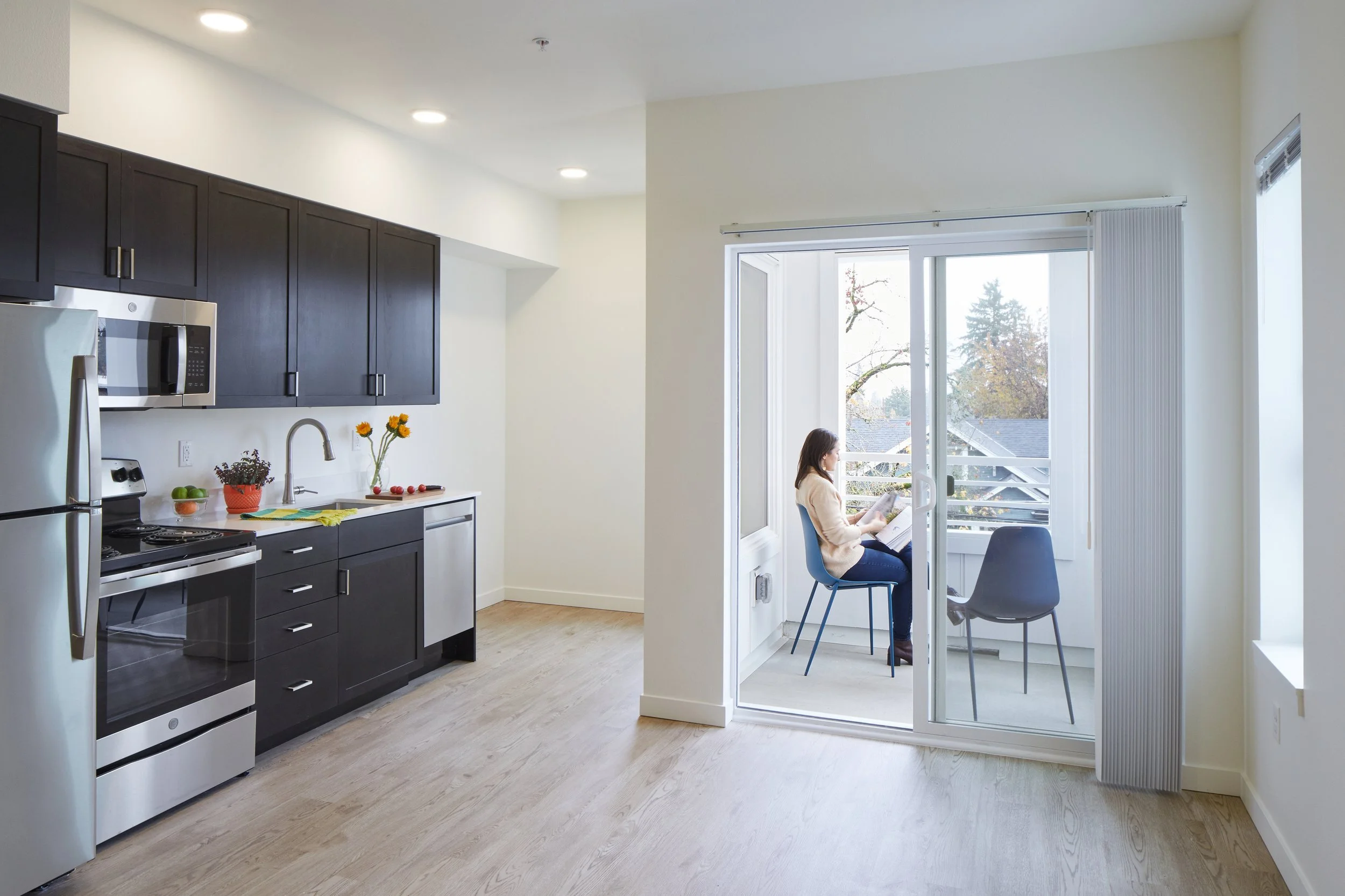 Situated on a modest infill lot, 330 Dekum contains 39 apartments, a mix of studio and one-bedroom units, in its 18,700 square feet, 34 of which are affordable based on the 60% area median income (AMI) threshold. The remaining five market-rate apartments are available as a way for existing tenants to remain in the building should their incomes increase beyond the AMI limit.