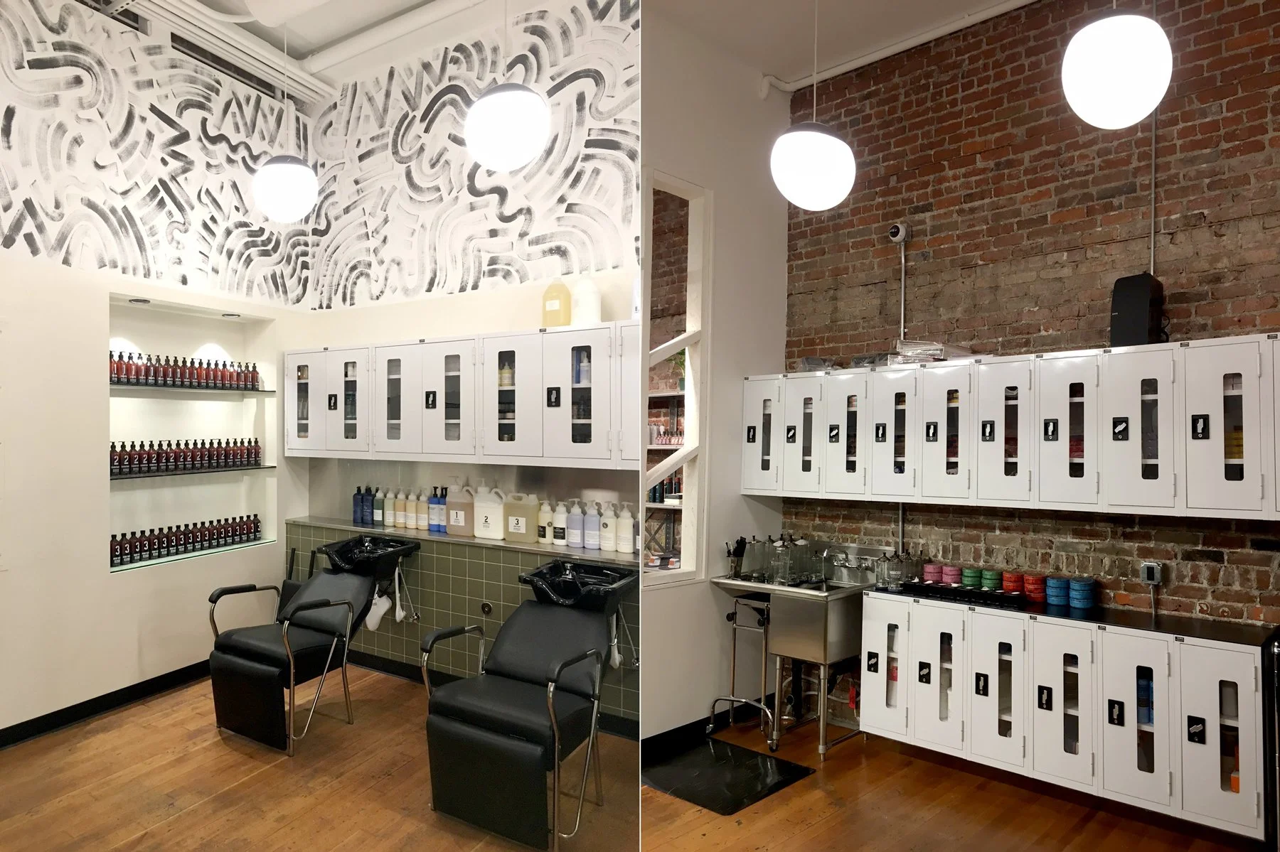To fit the Rudy’s design aesthetic, we designed and installed a large reclaimed wood partition wall, a one-quarter-plate steel shelf with an integrated clipper rail and a traditional tile wainscot. Walk into this new space today, and you’ll notice updated paint, lighting, and casework, all of which augment the existing brick walls and wood floors, while a custom mural wraps around multiple walls. The result is a modern and sophisticated space that harkens back to barbershops of days past.